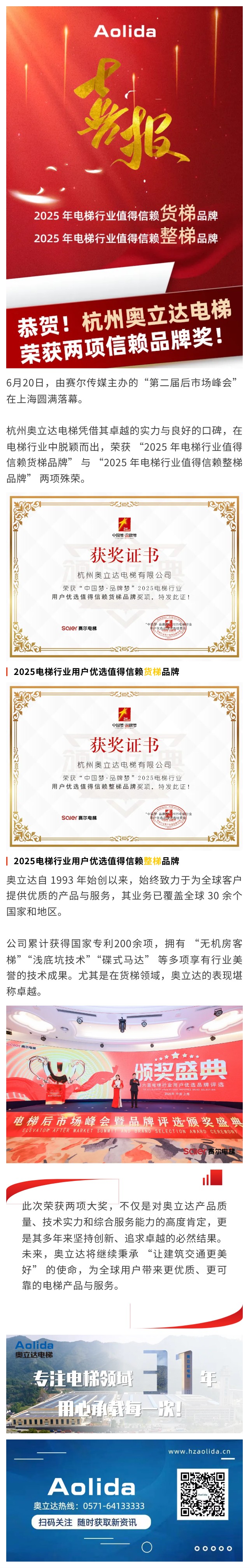 恭賀!杭州奧立達電梯榮獲兩項信賴品牌獎!